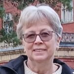 Therese has short gray hair and is wearing glasses as she smiles at the camera.